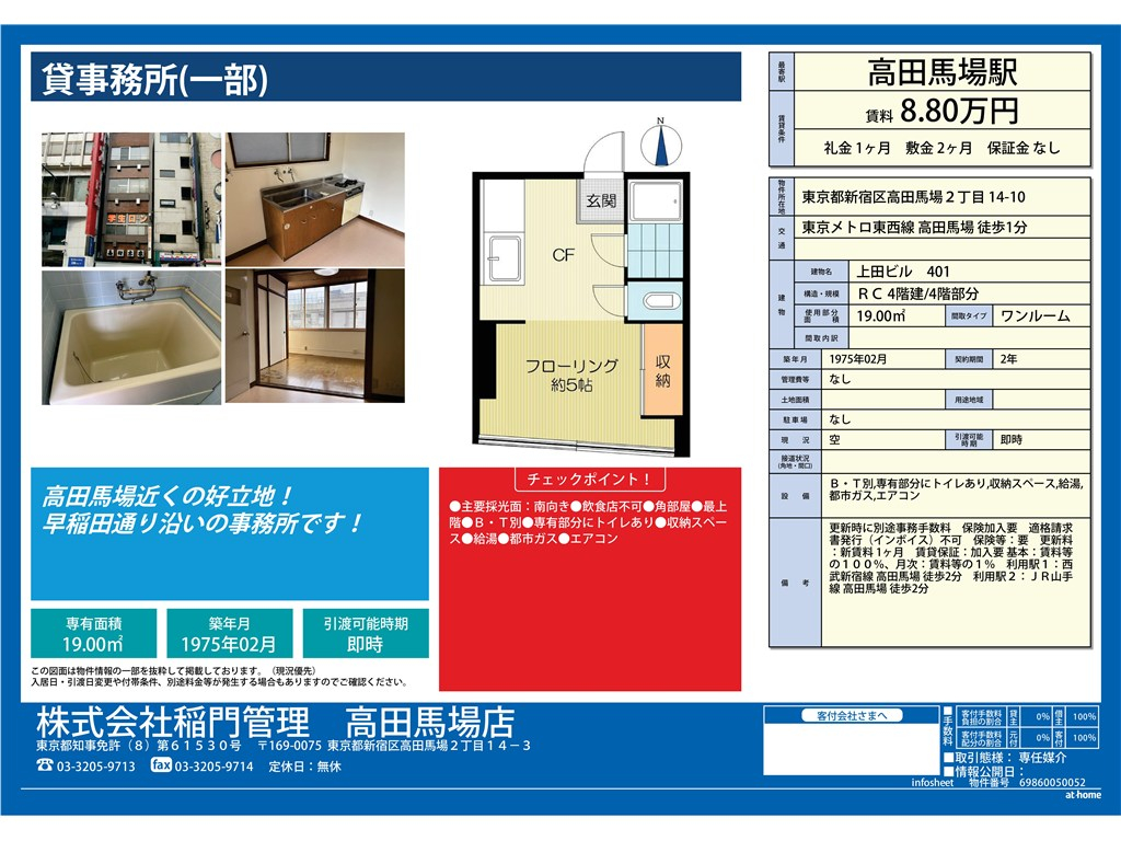 | 主要アクセス | 東京メトロ東西線 高田馬場駅 から 徒歩1分 | 保証金 | - | 面積 | 19m 2 ( 5.74坪 ) |