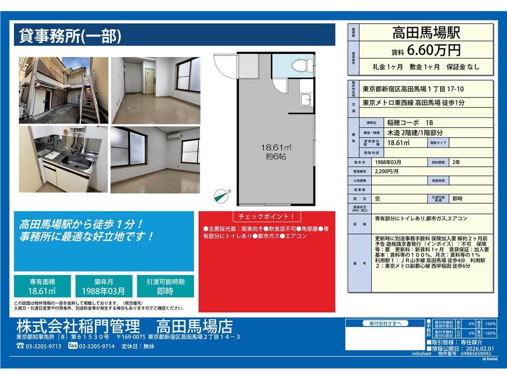 | 主要アクセス | 東京メトロ東西線 高田馬場駅 から 徒歩1分 | 保証金 | - | 面積 | 18.61m 2 ( 5.62坪 ) |