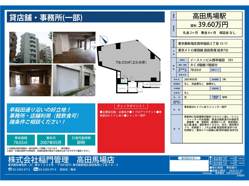 | 主要アクセス | 東京メトロ東西線 高田馬場駅 から 徒歩7分 | 保証金 | - | 面積 | 78.03m 2 ( 23.6坪 ) |