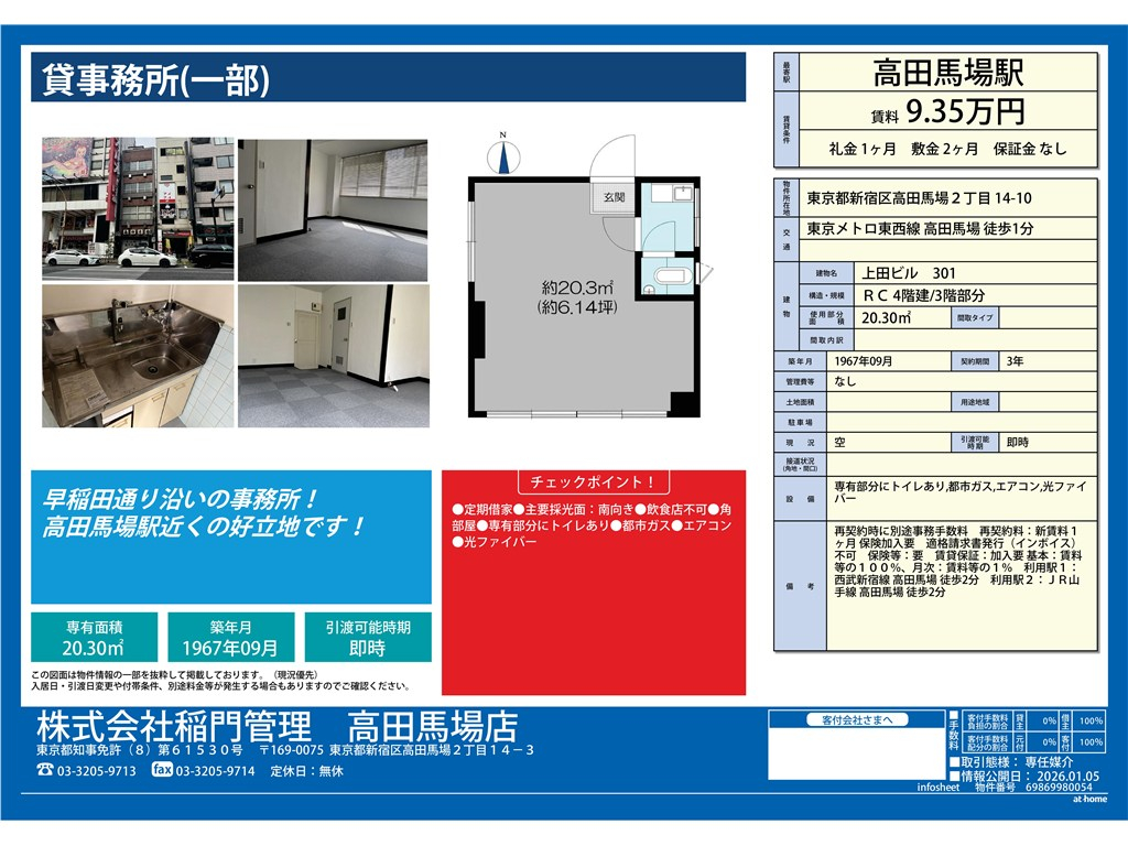 | 主要アクセス | 東京メトロ東西線 高田馬場駅 から 徒歩1分 | 保証金 | - | 面積 | 20.3m 2 ( 6.14坪 ) |